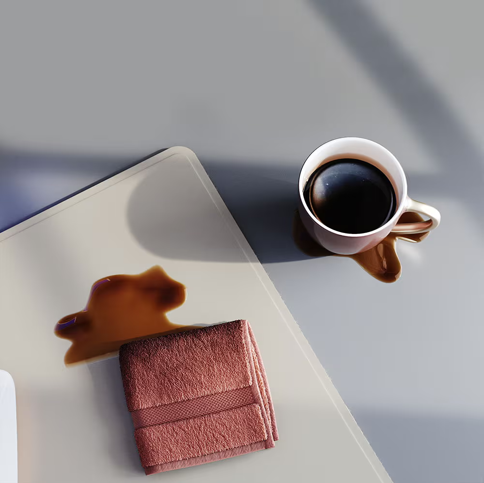 A: The desk mat is splashproof. But please do not machine wash the mats, to clean- you can use a mild soap with water, and a microfiber towel to wipe off any mess.